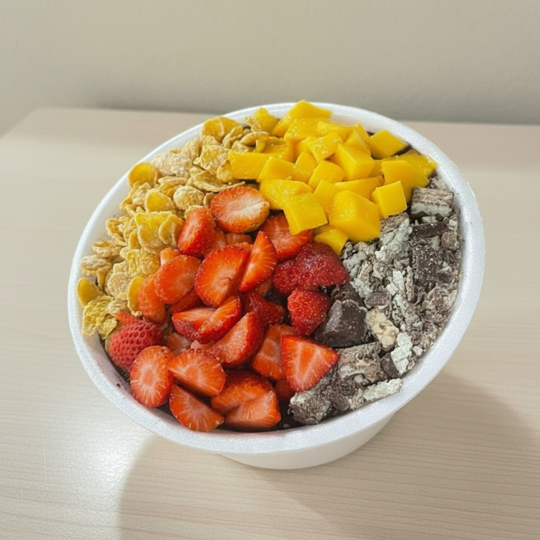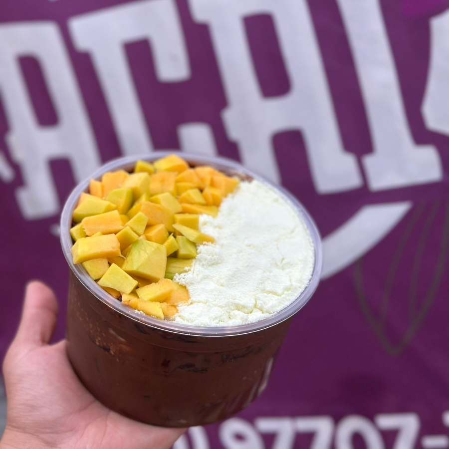 Barca encantadora de açaí com opção de escolha de massa, até 3 frutas fresquinhas e até 3 acompanhamentos.