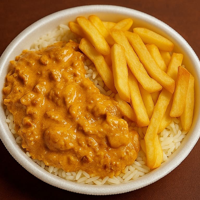 Acompanha arroz, Frango ao molho strogonoff e Batata Frita
