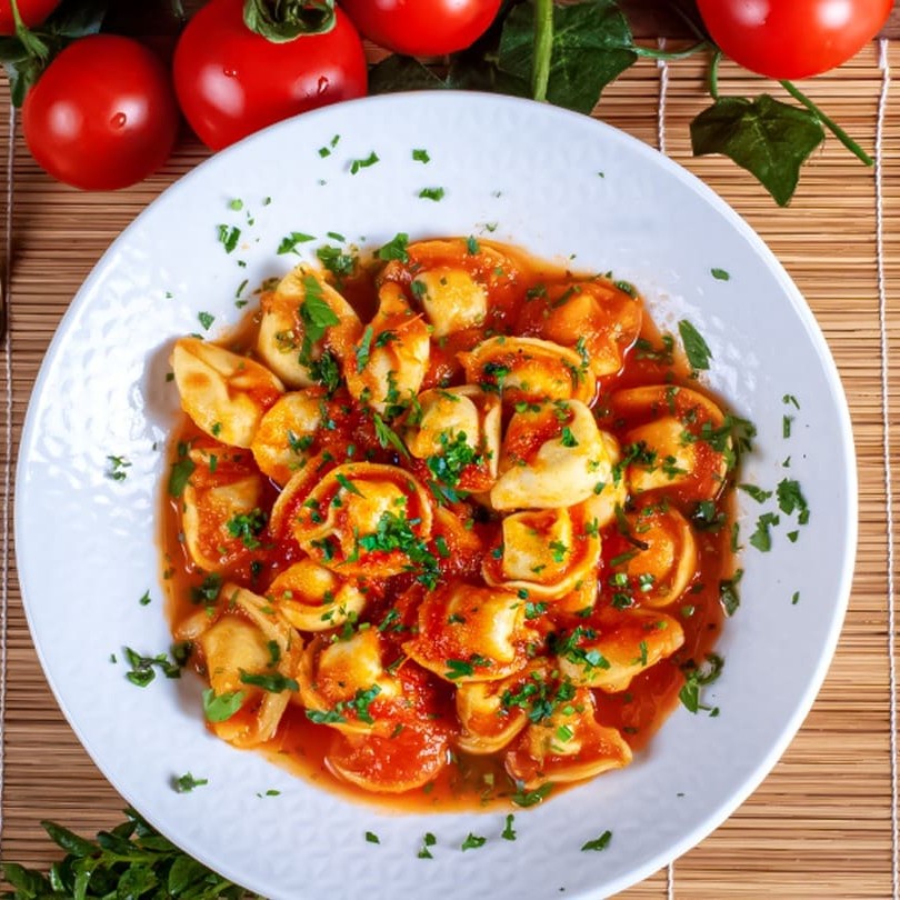 Tradicional capeletti de massa fresca italiana com recheio de frango ao molho de tomate