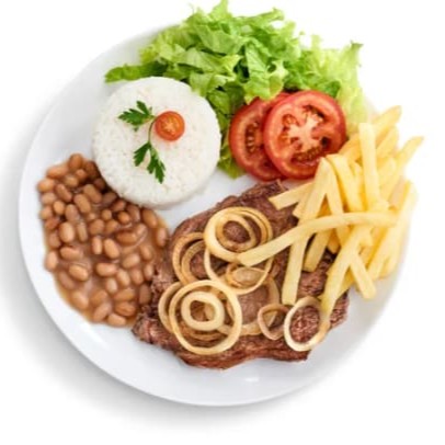 Acompanha arroz, feijão, fritas e salada com alface e tomate.