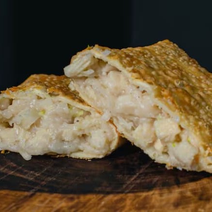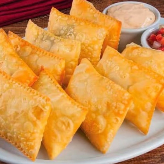 Frango Temperado com Catupiry, numa massa crocante e sequinha, Pastel de 20x10cm, recheado de ponta a ponta, preparado e frito na hora. *imagem ilustrativa