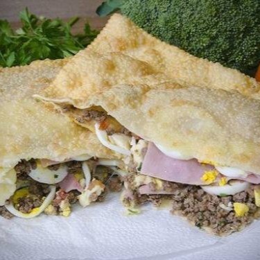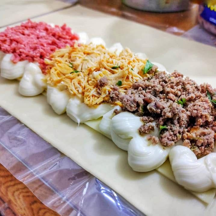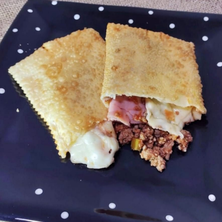 Pastel muito bem montado e recheado de 30cm, com frango temperado e desfiado, carne moída e ervas finas, calabresa moida, mussarela coberta com Catupiry
