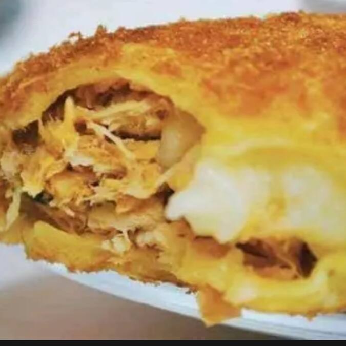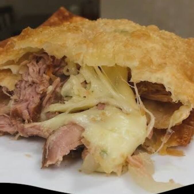 Massa de pastel, 300g de frango desfiado, Catupiry cremoso, milho verde e mussarela ralada.!