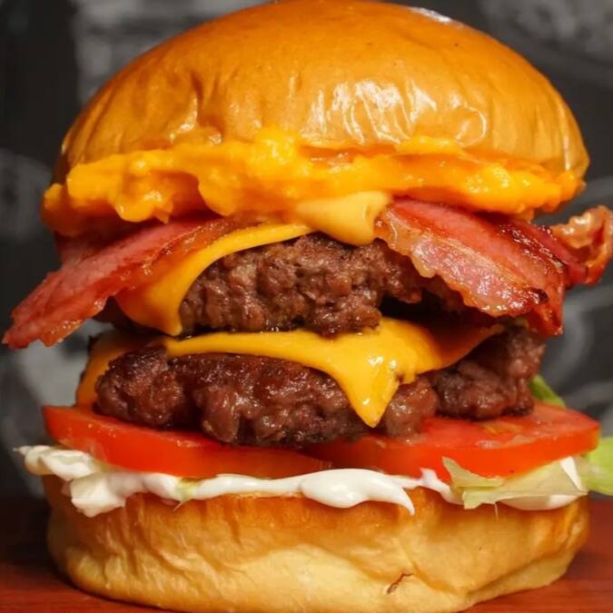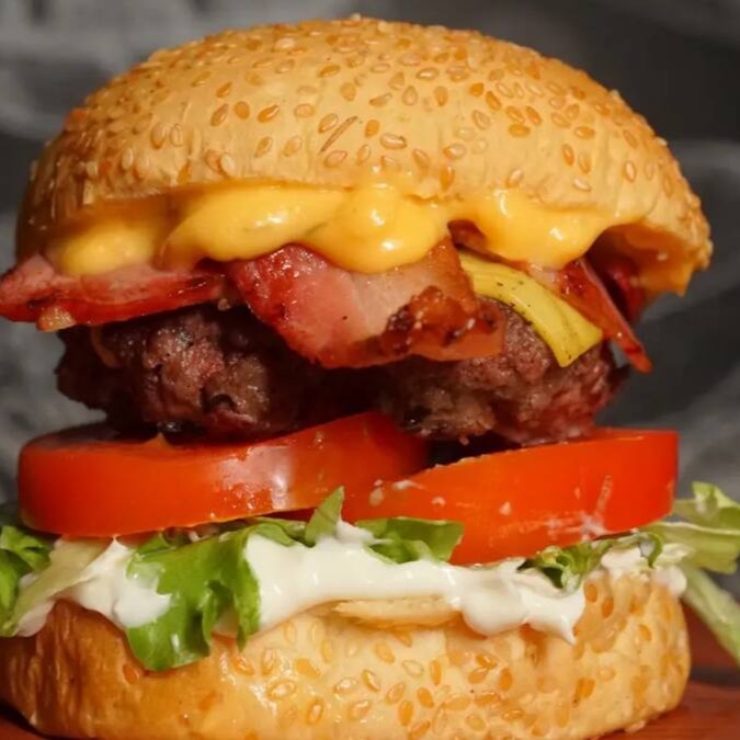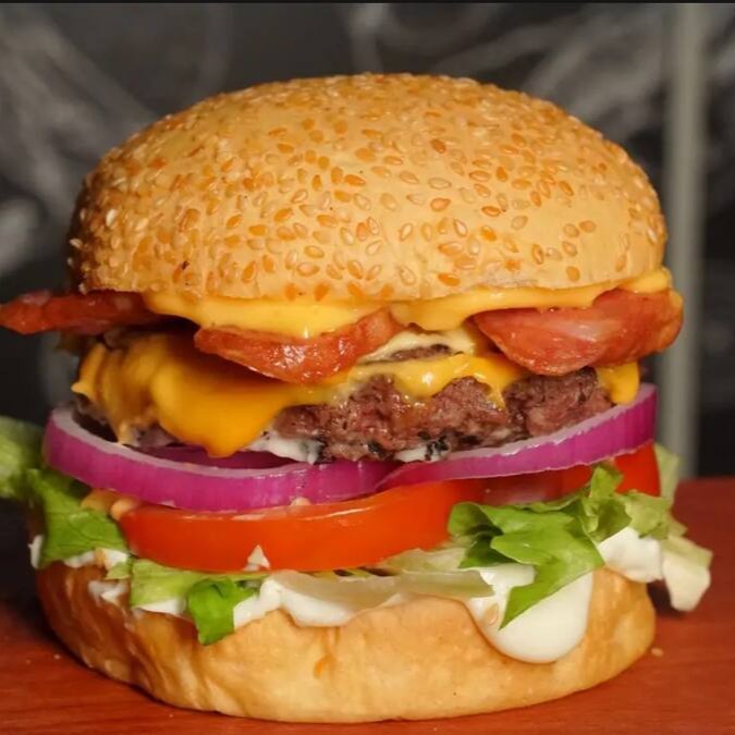 Pão de hambúrguer, 2 hambúrgueres artesanais de 120g cada, queijo, bacon, maionese da casa, alface, tomate, cebola roxa e molho especial.!