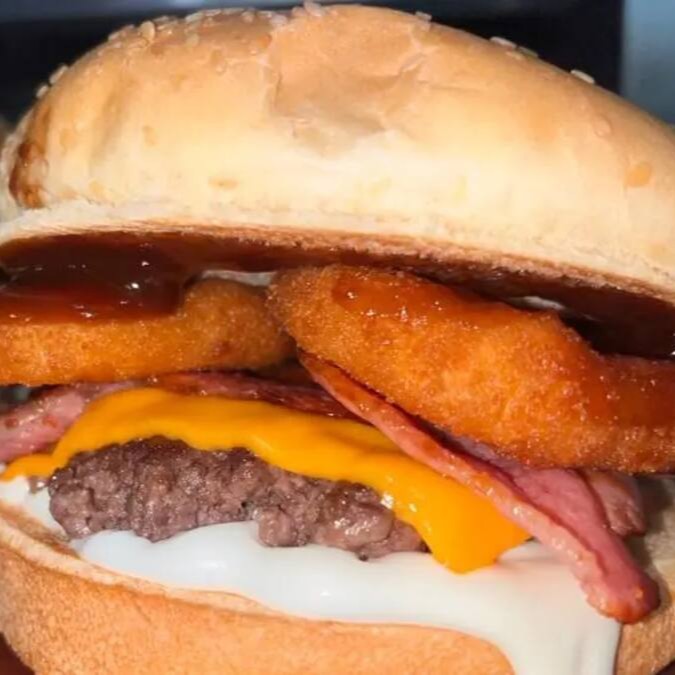 Pão de hambúrguer, hambúrguer Seara de 100g, queijo, bacon, onion rings (cebola empanada) maionese grill e molho barbecue.!
