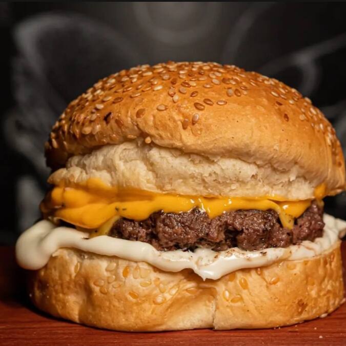 Pão de hambúrguer, hambúrguer Seara de 100g, cheddar, queijo e maionese da casa.