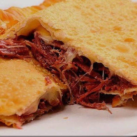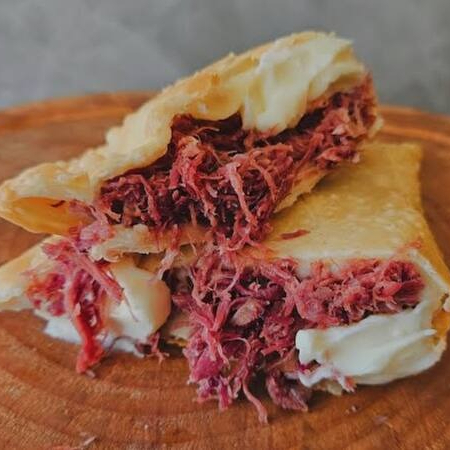 Massa de pastel, 200g de carne seca com Catupiry acompanha molho da casa e vinagrete