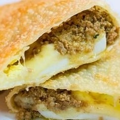Carne moída refogada e queijo mussarela ralada.