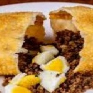 Pastel de Feira de carne moída refogada com ovo cozido picado.