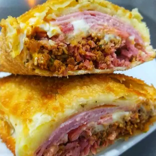 Carne,calabresa,cheddar,cream cheese,tomate,presunto,queijo e orégano