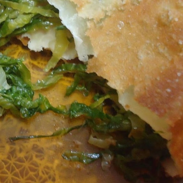 Massa Crocante e Sequinha com Escarola Temperada , Mussarela , Bacon , Alho Frito e Parmesão