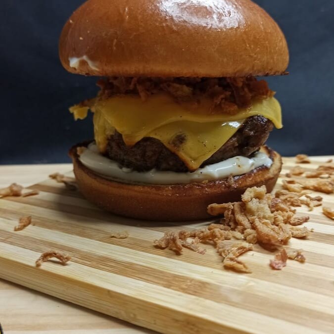 Pão de gergelim, maionese defumada, hamburguer de 56 gramas, queijo prato e cebola crispy