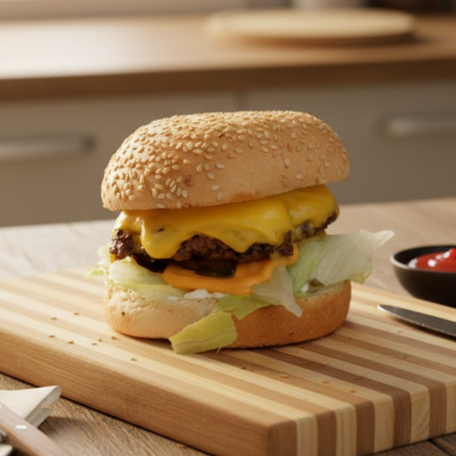 Pão de gergelim, 2 hambúrguer de 56 grs picanha, queijo prato, alface americana, tomate e maionese defumada