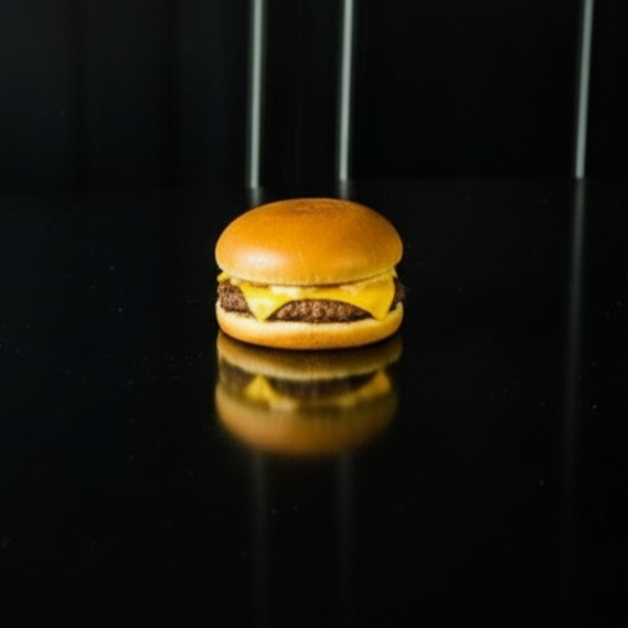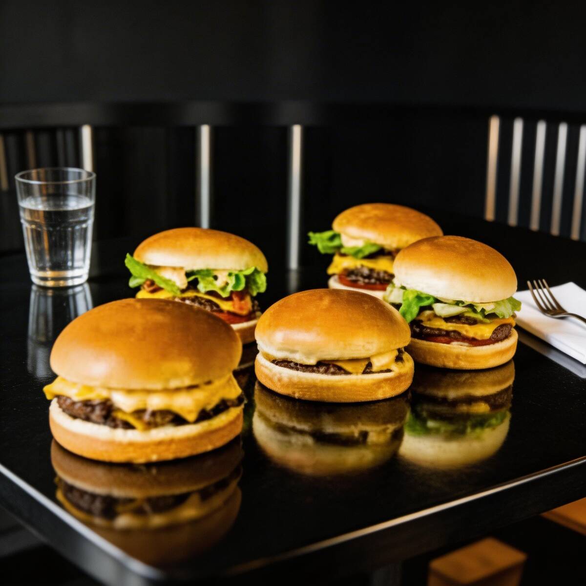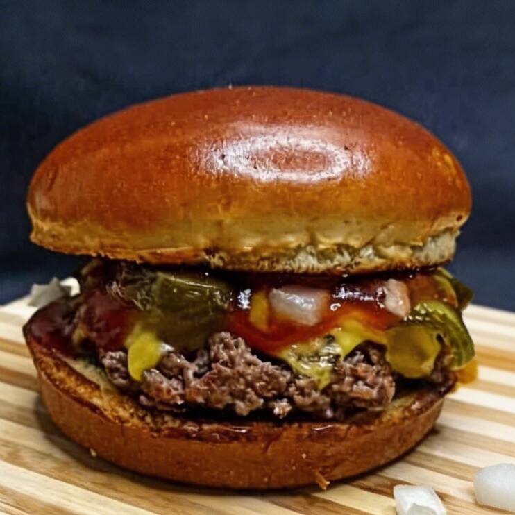 Pão de Gergelin, maionese defumada, hamburguer de 56 gramas, cebola picada, picles, mostarda e ketchup