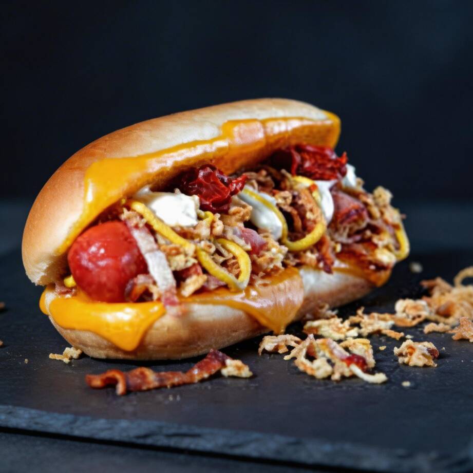01 salsicha perdigão, maionese temperada da casa, milho, ervilha, purê, cheddar, Catupiry scala e cebola crispy.