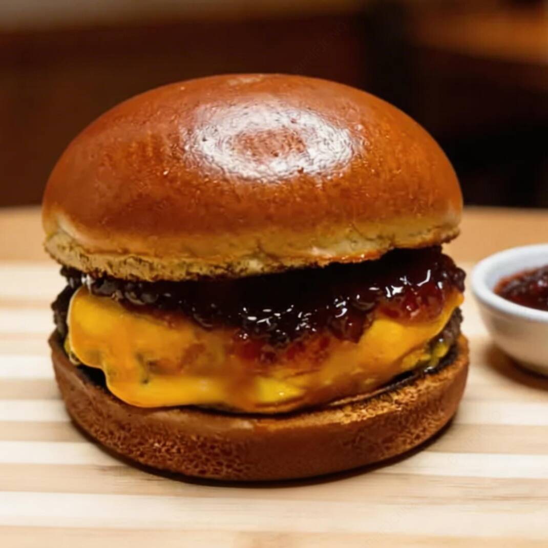 Brioche artesanal, maionese defumada, blend 100 grs de costela, queijo prato e geléia de pimenta