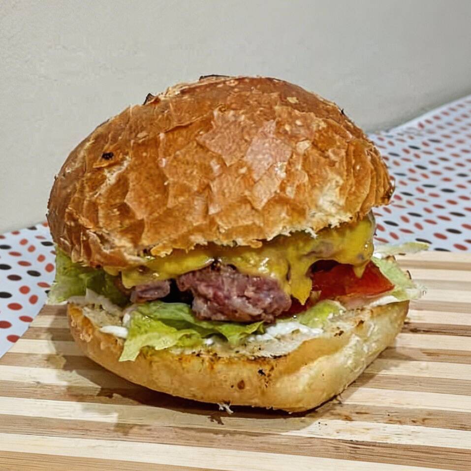 : Pão de gergelim, hambúrguer 56 grs picanha, queijo prato, alface americana, tomate e maionese defumada