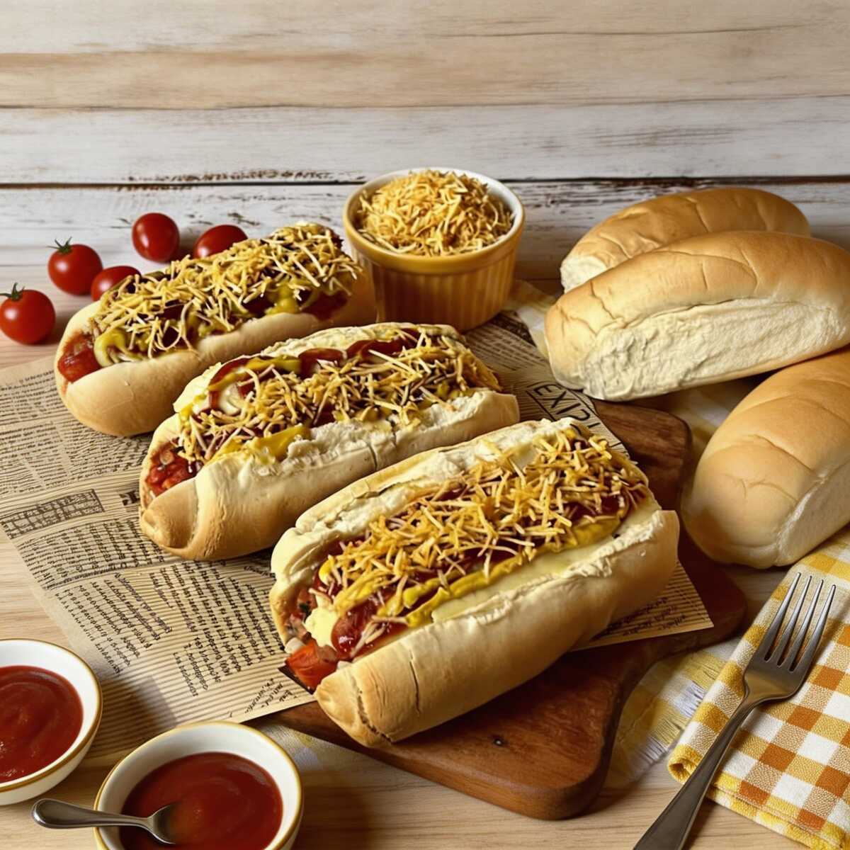 02 salsicha perdigão, maionese temperada da casa, milho, ervilha, purê, cheddar, Catupiry scala e batata palha.