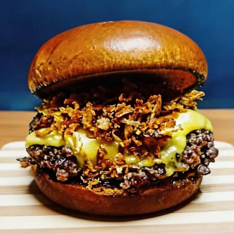 Brioche artesanal, maionese defumada, blend 100 grs de costela, queijo prato e muita cebola crispy