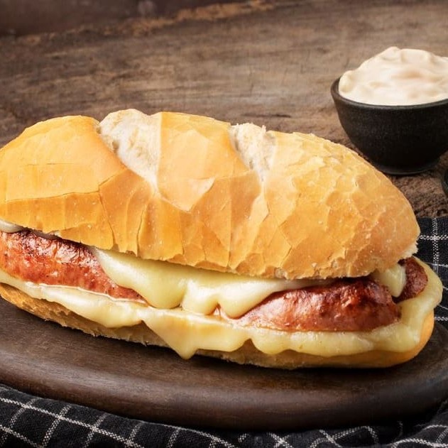 Pão francês, linguiça artesanal de Bragança, cebola roxa, queijo e vinagrete.