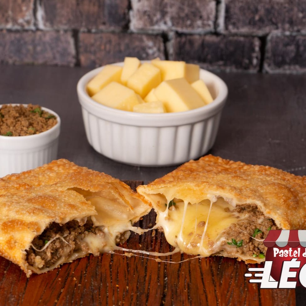Carne moída bem temperada e soltinha, com delicioso queijo mussarela! (Não é possível retirar ou acrescentar ingredientes. Imagens ilustrativas) _ _#carne#queijo#pastel#calabresa #Catupiry#palmito#atum#chocolate