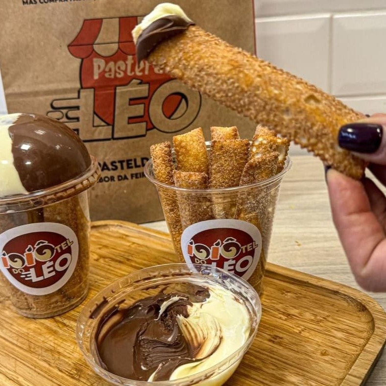 Conheça o Ioiôtel, a mais nova sobremesa do Pastel do Léo! A nossa deliciosa massa de pastel cortada em tirinha, coberta com açucar e Canela, acompanhada de chocolate ao leite e chocolate branco! Uma delicia, com sabor de infância! Uma sobremesa que dá água na boca!