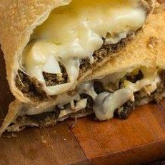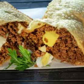 Irresistível pastel feito com carne moída, ovos , apresuntado, muçarela e azeitonas.