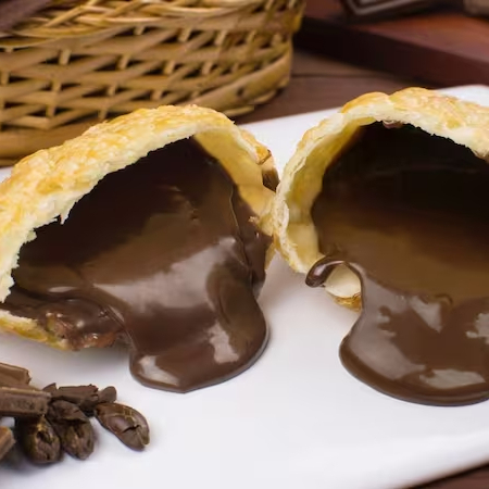 A melhor e mais crocante massa de pastel da cidade com nosso recheio de chocolate ao leite.