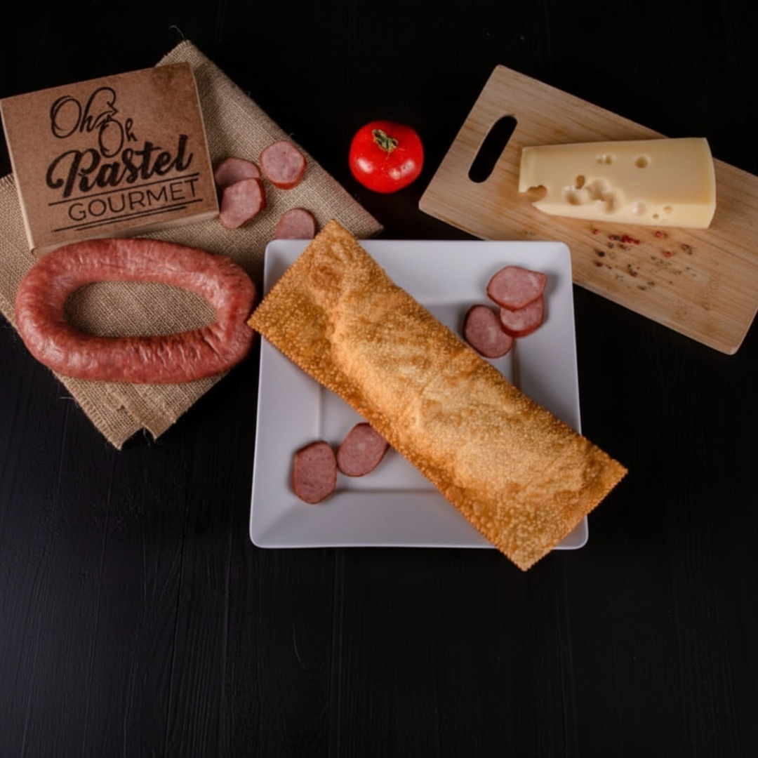 Aprecie a nossa versão gourmet do tradicional pastel de calabresa com queijo. Uma combinação harmoniosa de calabresa moída finamente, impregnada com sabor intenso e marcante, e queijo de excelência inquestionável, proporcionando uma combinação perfeita de texturas e sabores. Este pastel, exclusivo da nossa casa 'Ôh Pastel Gourmet', é uma verdadeira delícia que eleva a experiência culinária a um no