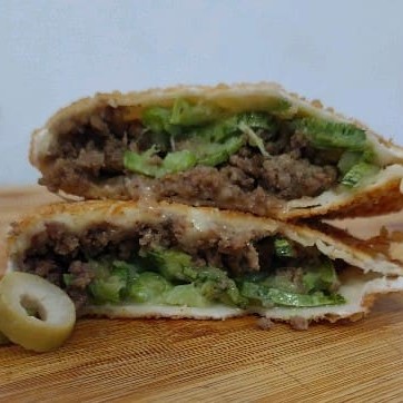Carne moída temperada refogada, queijo muçarela, abobrinha no vapor, cebola e azeitona.