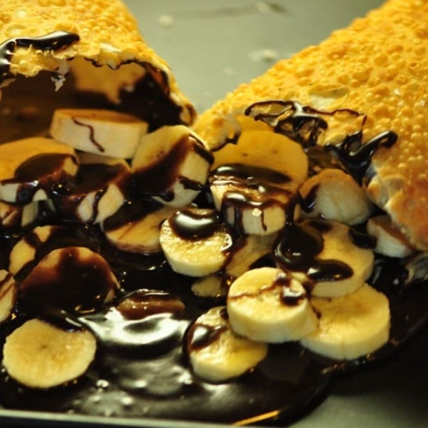 Massa crocante com recheio de chocolate derretido com pedaços de banana, empanada com açúcar e canela. Pastel pastel pastel pastel pastel pastel pastel pastel pastel pastel pastel pastel pastel pastel pastel pastel pastel
