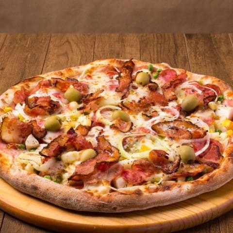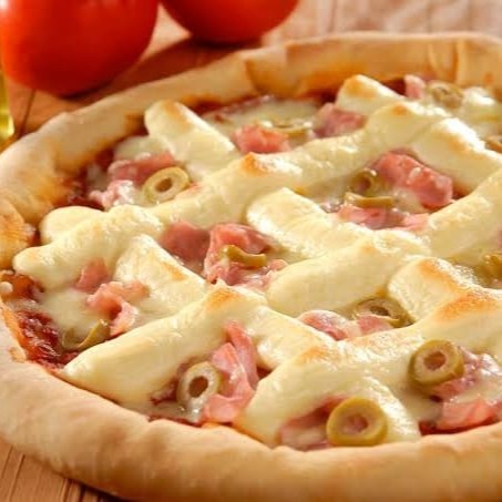 Presunto cozido com ovos cebola mussarela e oregano com azeitonas selecionadas