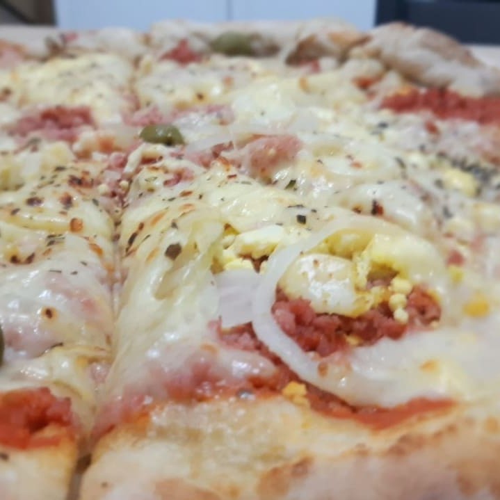 Meia mussarela e meia calabresa acebolada calabresa de altissima qualidade mussarela derretida na boca combinação pefeita