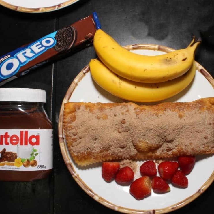Chocolate com banana. Acompanha açúcar e canela,Recheio de ponta a ponta.