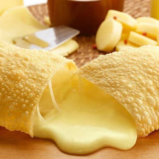 Delicioso pastel de 22cm recheado com queijo muçarela. Pastel montado e frito na hora, em óleo de algodão, o que garante uma fritura mais leve e também um pastel sequinho e crocante.