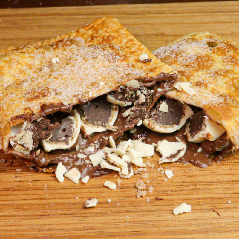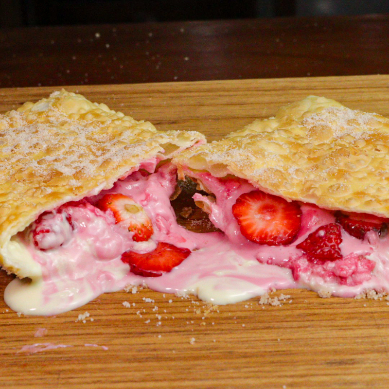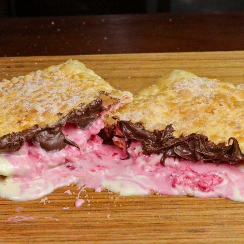 Chocolate ao leite, creme de leite ninho e creme de morango.