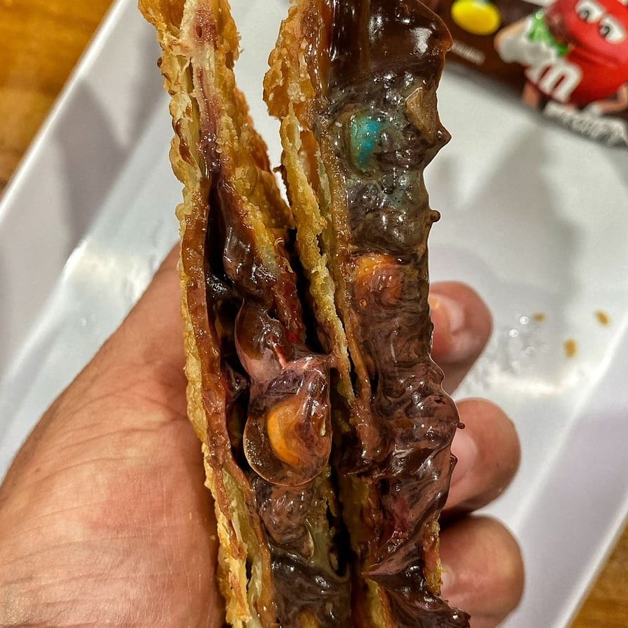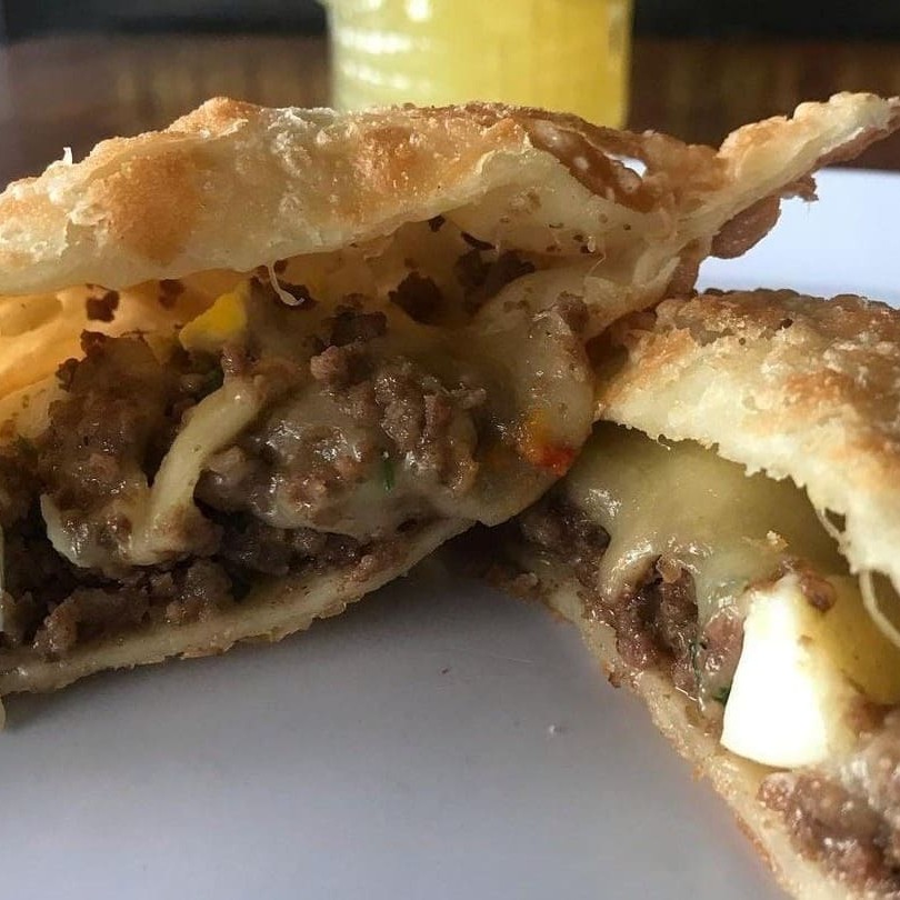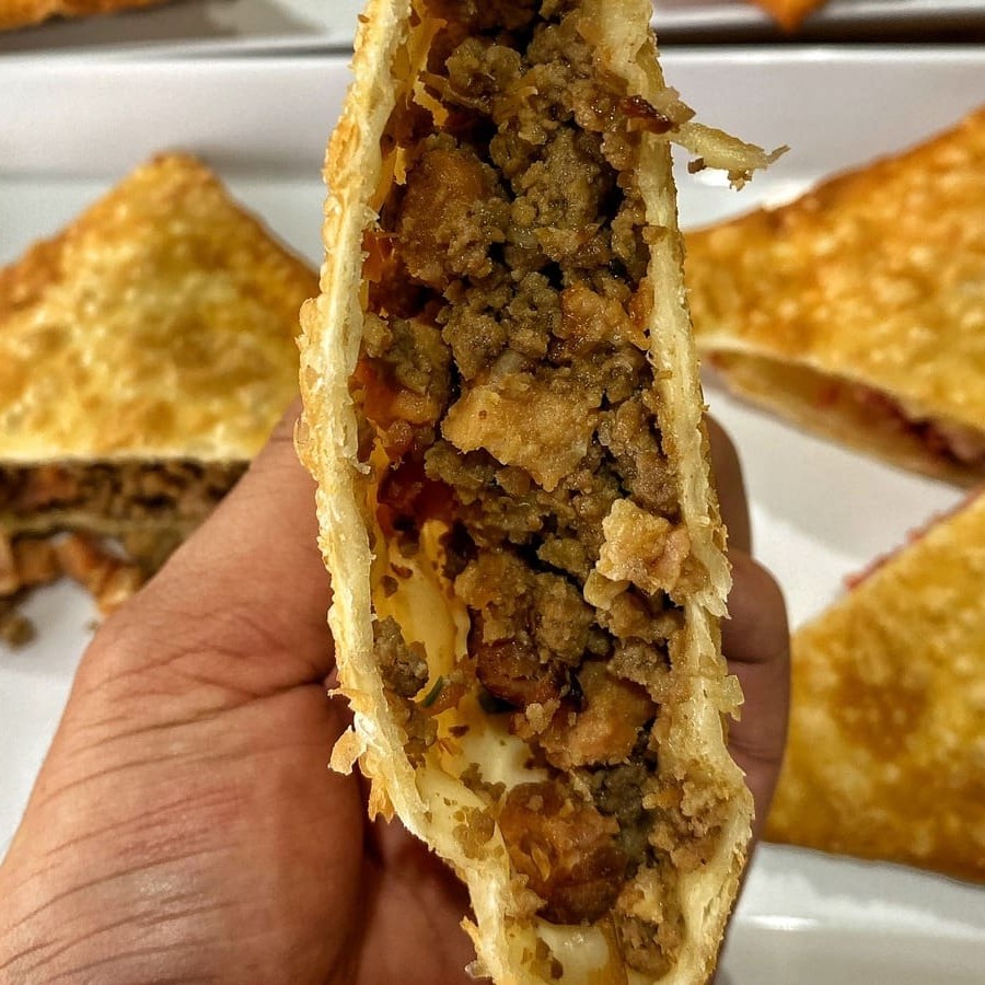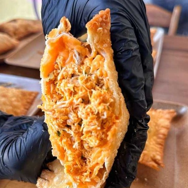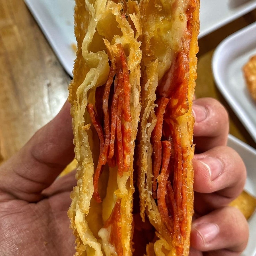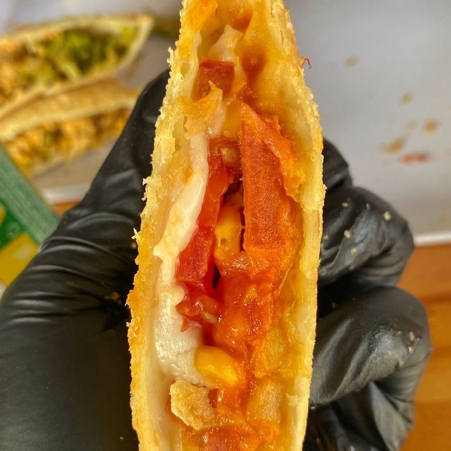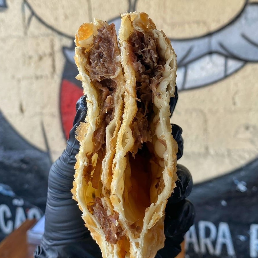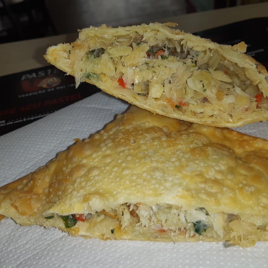 Carne, frango, mussarela, presunto, calabresa, requeijão tipo catupiri, cheddar, tomate, azeitona, ovo, cebola e salsa. São 30 centimetros de pastel.