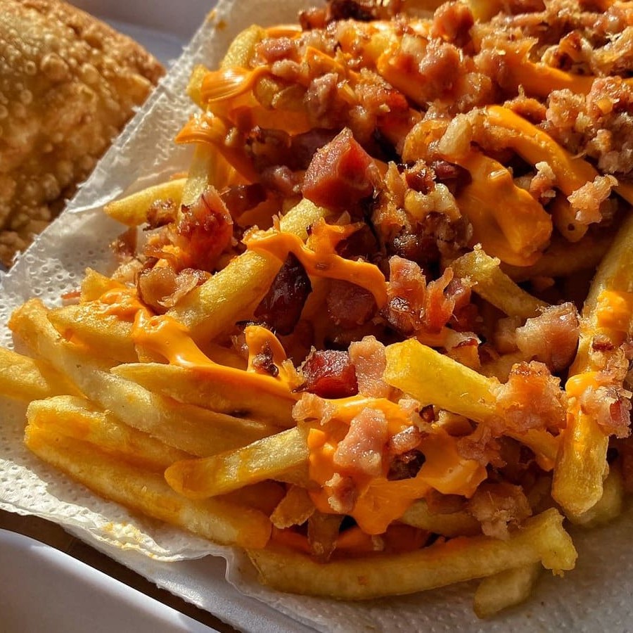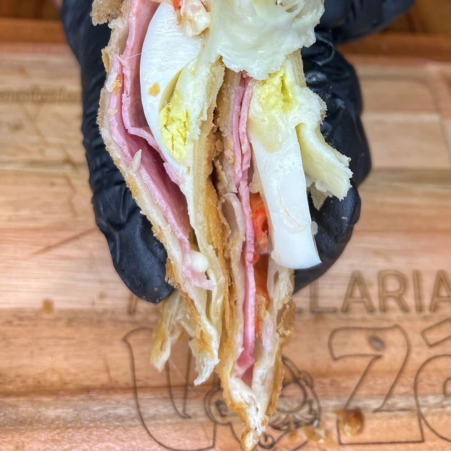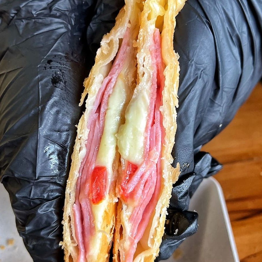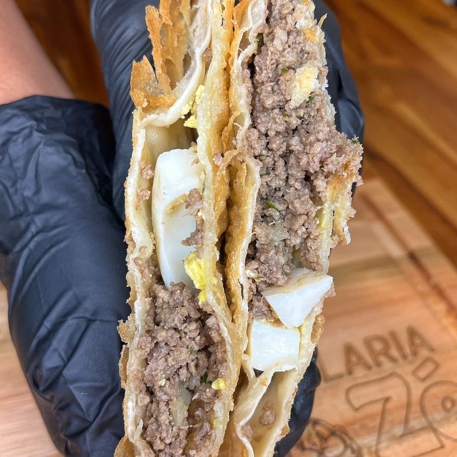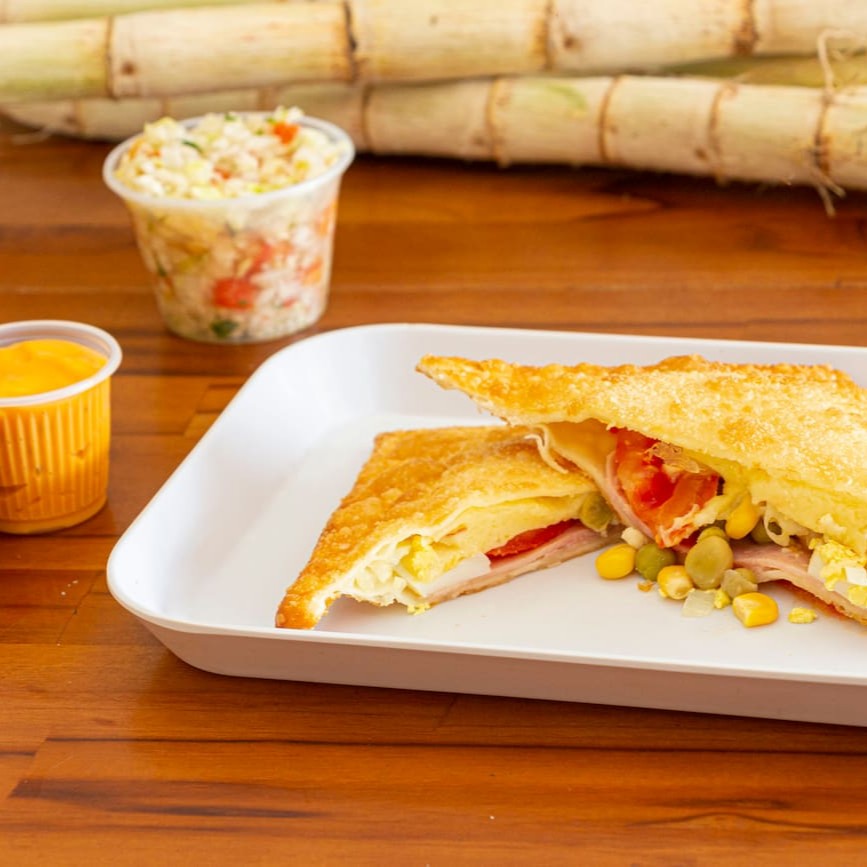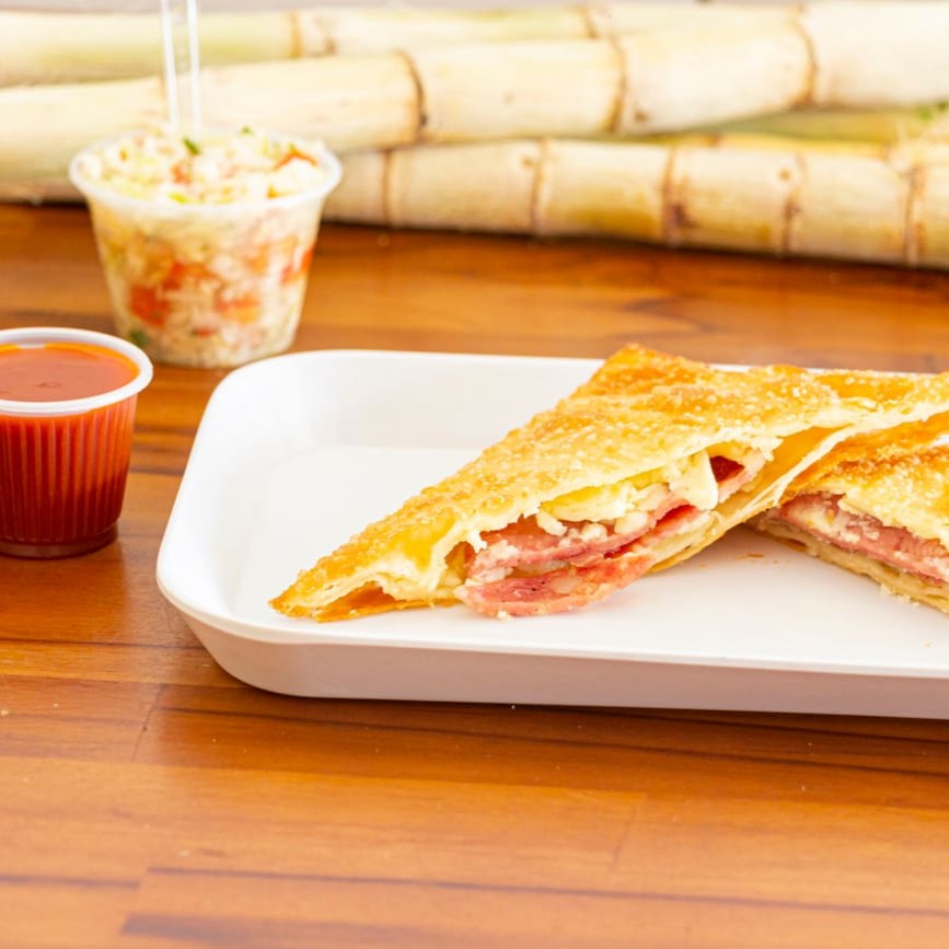 Carne, mussarela, presunto, calabresa, tomate, azeitona, ovo, cebola e salsa. São 30 centimetros de pastel.