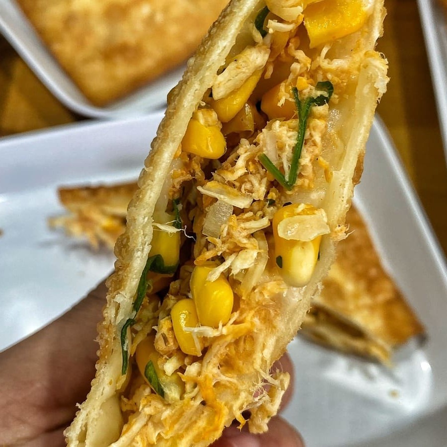 Frango, requeijão tipo Catupiri, milho, calabresa, ervilha, cebola e salsa.