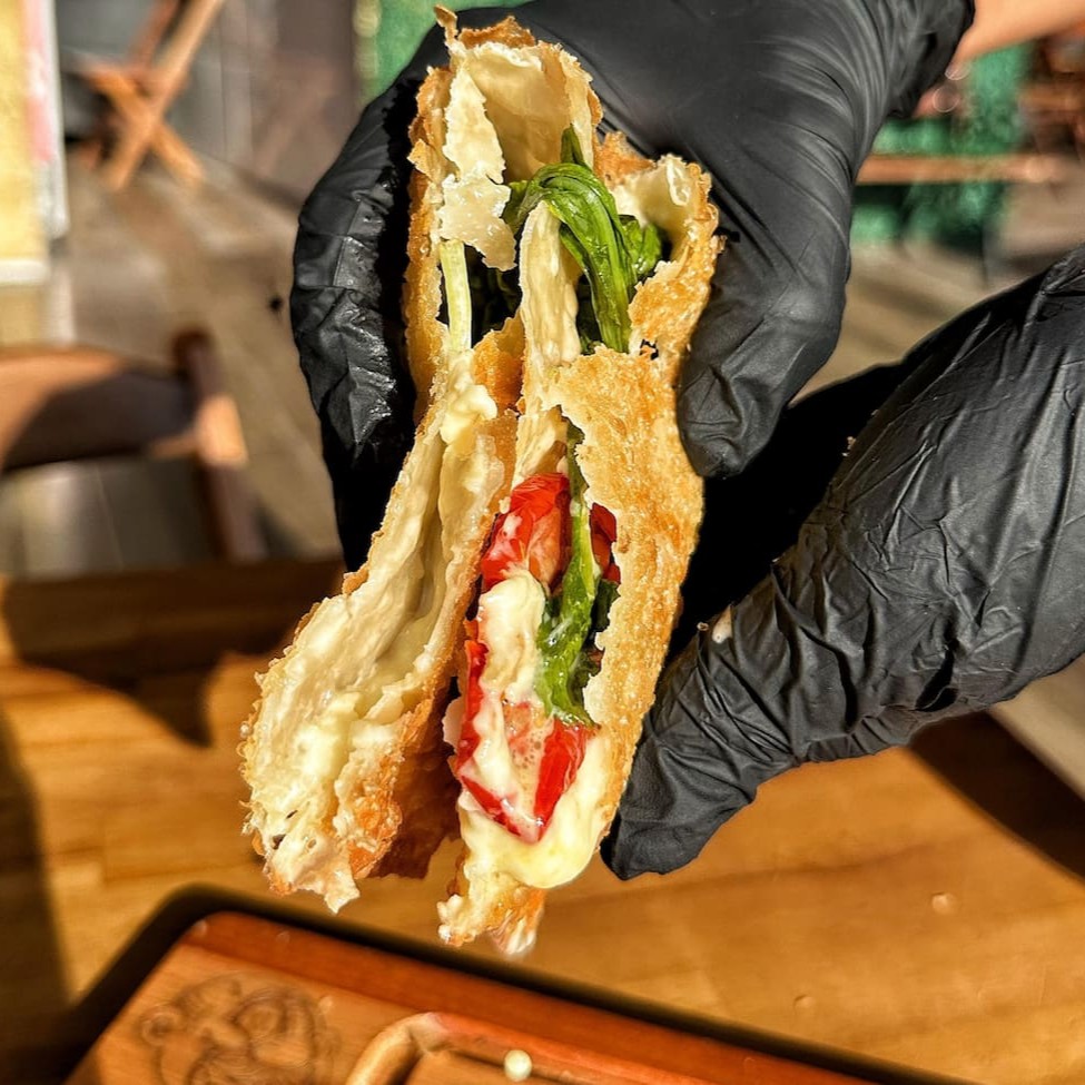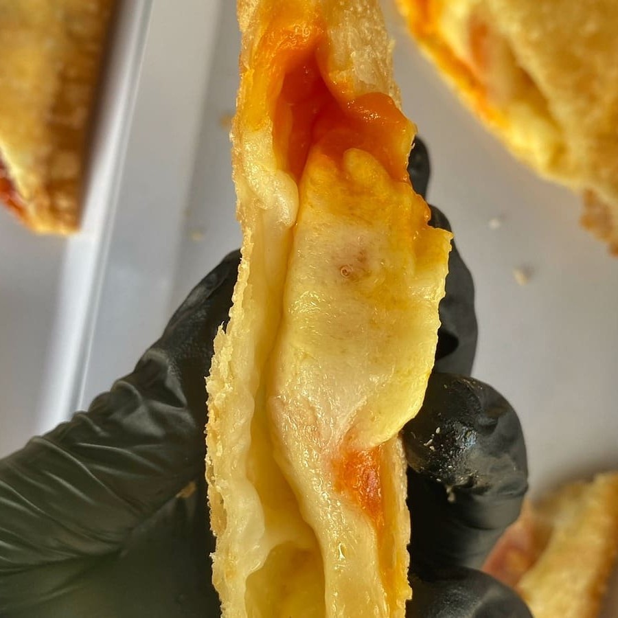 Calabresa Moída, Ovo, Mussarela, Molho de Pimenta e Cebola Picada.