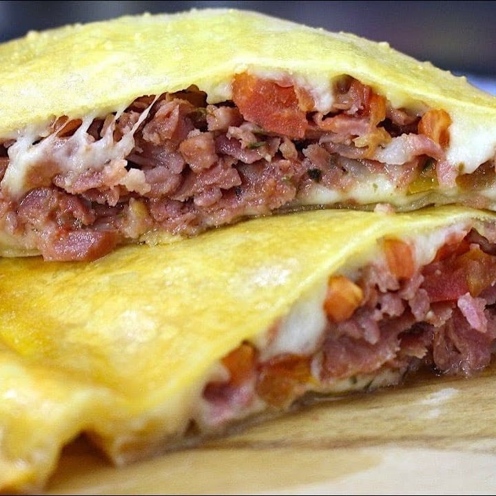 Pastel de Carne, Provolone e Bacon: Recheado com carne suculenta, provolone derretido e bacon crocante, uma combinação de sabores intensos e deliciosos em cada mordida.