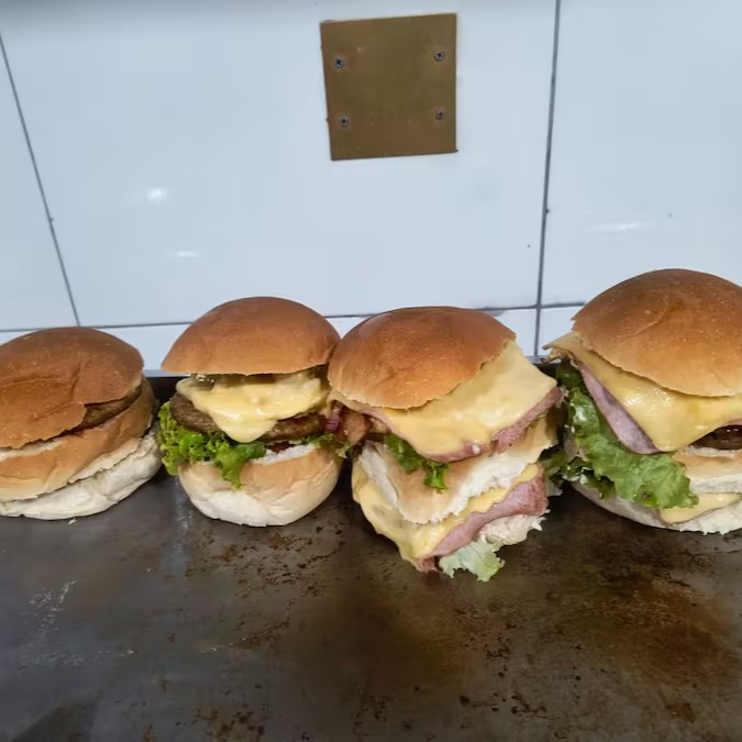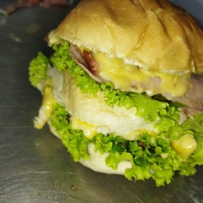 Pão de hambúrguer, 2 hambúrgueres, queijo, bacon, presunto, ovo, tomate, alface e maionese.