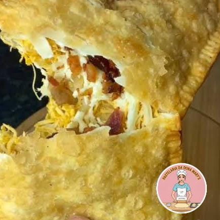Pastel de frango desfiado, cheddar, bacon em cubos