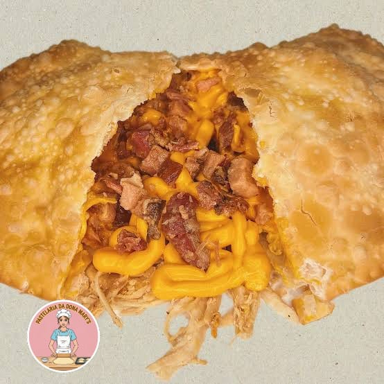 Pastel de calabresa em rodelas, bacon em cubos, e cheddar cremoso