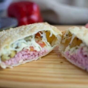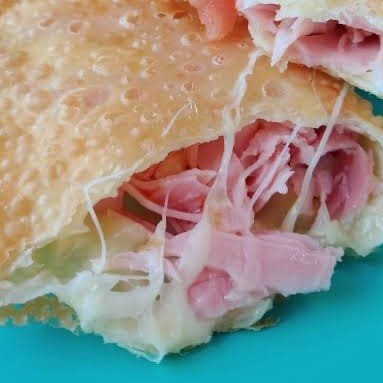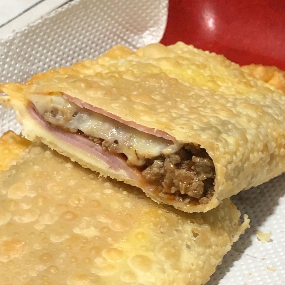 Pastel recheado com carne moída, molho de tomate e presunto, acompanhado de uma massa sequinha e crocante.