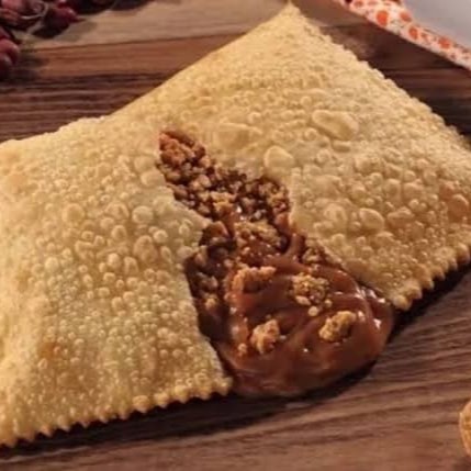 Pastel recheado com chocolate, combinado com a textura crocante da paçoca e Sonho de Valsa, acompanhado de uma massa sequinha e crocante.