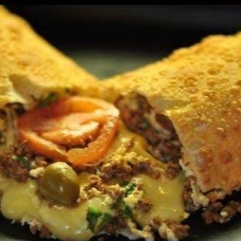 Pastel enorme super recheado com carne moída, milho, ovo, queijo, azeitona e tomate.