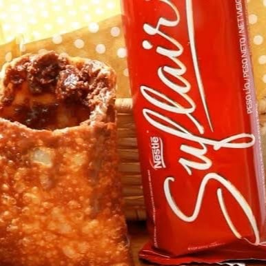 Pastel recheado com bombom Ouro Branco ou Sonho de Valsa, acompanhado de uma massa sequinha e crocante.