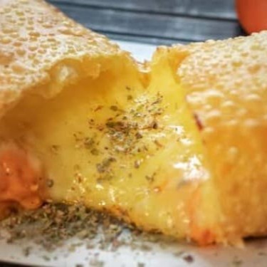 Pastel recheado com mussarela, Catupiry, cheddar e queijo branco, acompanhado de uma massa sequinha e crocante.