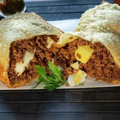 Pastel recheado com carne moída e ovo cozido, acompanhado de uma massa sequinha e crocante.